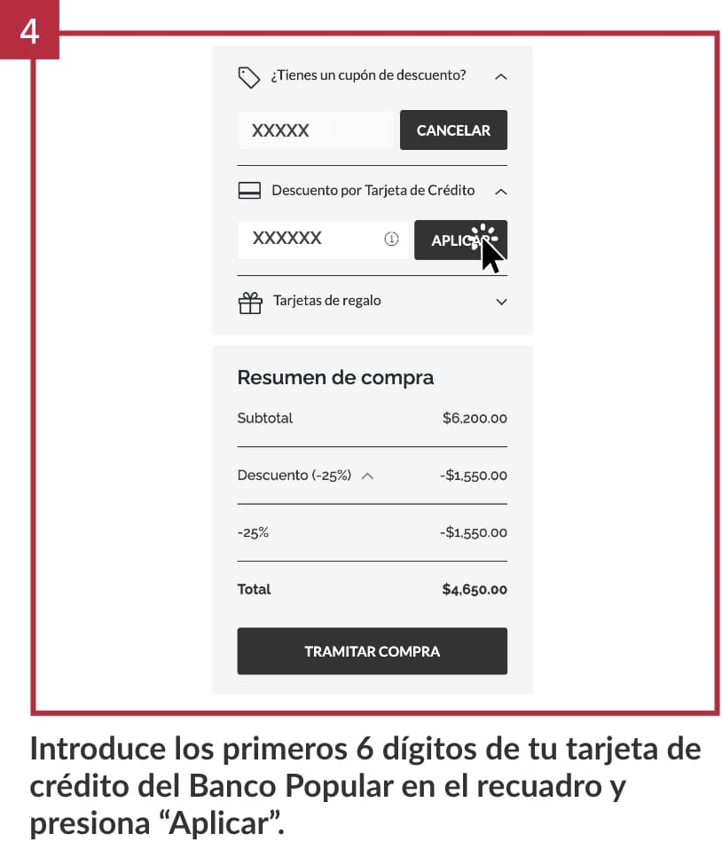 Para aplicar el descuento debes colocar los primeros 6 dígitos de tu Tarjeta de Crédito del Banco Popular previo a procesar el pago.
