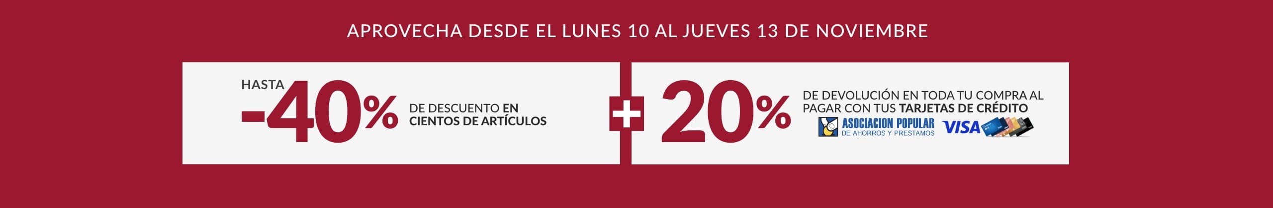 Promoción aplica en tienda física y online desde el lunes 10 al jueves 13 de noviembre 2025. Hasta un 20% de cashback en toda la compra al pagar con Tarjetas de Crédito Visa APAP y su Cuotas Más Límite asociada. Mínimo de consumo acumulado de RD$5,000.00. Tope devolución de RD$8,000.00 por cliente. Participan las Tarjetas de Crédito Visa APAP y su Cuota Más Límite física y virtual, a excepción de Tarjetas Familiar y Sirena APAP. El cashback será acreditado en 35 días laborables luego del cierre de la promoción. El cashback de los consumos realizados con Cuotas Más Límite será acreditado en la tarjeta de crédito principal, la cual debe estar en estatus activa y en uso. Si al momento de aplicar el cashback la tarjeta se encuentra en atraso o cancelada, no aplicará el reembolso.