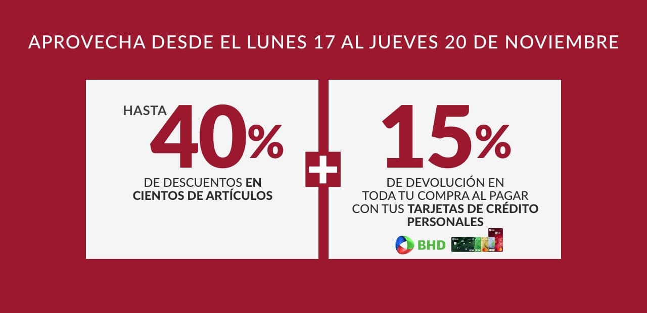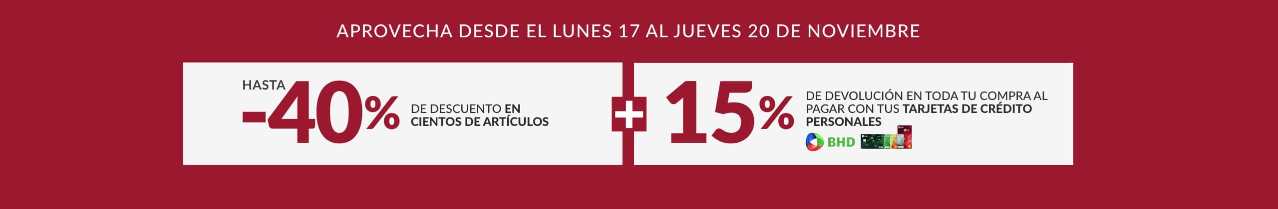 Promoción aplica en tienda física y online desde el lunes 17 hasta el jueves 20 de noviembre 2025. Válido para Tarjetas de Crédito Personales BHD y su línea de Cuotas. Mínimo de consumo acumulado para aplicar a devolución: Clásicas RD$8,000, Gold RD$10,000, Platinum RD$15,000, Infinite y Black RD$20,000. Tope de devolución por el total de los consumos acumulados por cliente y sus adicionales: Clásicas RD$4,000, Gold RD$6,000, Platinum RD$8,000, Infinite y Black RD$10,000. También aplican los consumos de las tarjetas adicionales y pagos en Cuotas. Los consumos en Casa Cuesta Agora Mall Santo Domingo y Santiago aplican para el bono de regalo que estaremos regalando en la plaza por compras iguales o mayores a RD$6,000. La devolución será aplicada en el transcurso de los 45 días posteriores a la promoción. Consulta mas en bhd.com.do