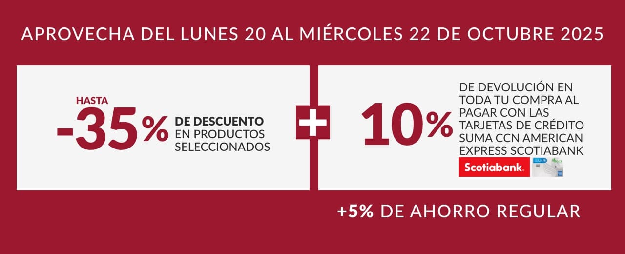 Promoción aplica en tienda física y online desde el lunes 20 al miércoles 22 de Octubre 2025. Mínimo de consumo para aplicar a la devolución RD$5,000.00. El monto máximo de devolución RD$5,000.00 por cliente, sobre el acumulado de consumos realizados con las tarjetas participantes. Los consumos realizados con las tarjetas adicionales serán sumados a la tarjeta principal. El 10% será acreditado a más tardar 45 días calendario luego de finalizado el Período de Vigencia, más 5% de ahorro regular al pagar con la Tarjeta de Crédito Suma CCN American Express®, reflejado en su Estado de Cuenta. Aplica la tarjeta Suma CCN American Express® Scotiabank. Aplica también la Tarjeta de Crédito participante con logo de Progreso.®Marca Registrada de The Bank of Nova Scotia, utilizada bajo licencia. American Express es una marca de American Express. Las tarjetas son emitidas por Scotiabank República Dominicana bajo licencia de American Express. Consulta los T&C en do.scotiabank.com/promociones