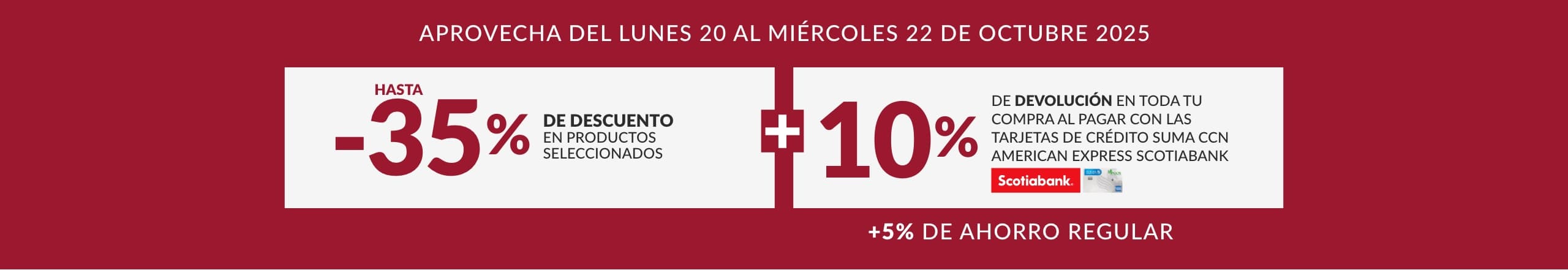 Adicional, 5% de ahorro regular al pagar con la Tarjeta de Crédito SUMA CCN American Express® Scotiabank.