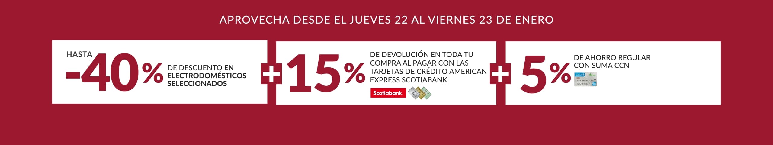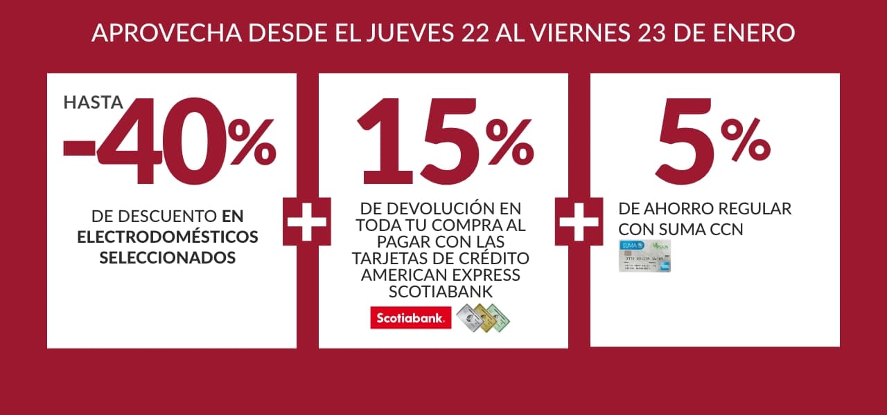 Promoción aplica en toda la web desde el jueves 22 y viernes 23 de enero 2026. Mínimo de consumo para aplicar a la devolución RD$10,000.00. El monto máximo de devolución RD$5,000.00 por cliente, sobre el acumulado de consumos realizados con las tarjetas participantes. Los consumos realizados con las tarjetas adicionales serán sumados a la tarjeta principal. El 15% será acreditado a más tardar 45 días calendario luego de finalizado el Período de Vigencia, más 5% de ahorro regular al pagar con la Tarjeta de Crédito Suma CCN American Express®, reflejado en su Estado de Cuenta. Aplican las Tarjetas de Crédito Personales American Express® Scotiabank República Dominicana. No participan en esta Promoción la Tarjeta de Crédito Comercial American Express® Scotiabank ni Tarjeta de Crédito de Marca Compartida: Carrefour American Express® Scotiabank. ®Marca Registrada de The Bank of Nova Scotia, utilizada bajo licencia. American Express es una marca de American Express. Las tarjetas son emitidas por Scotiabank República Dominicana bajo licencia de American Express. Consulta los T&C en do.scotiabank.com/promociones